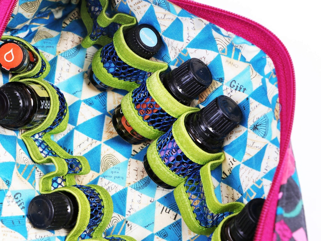 Mesh dividers separate and protect essential oils or nail polish in bottles from 5 to 15 ml and up to 3½” tall. Additional space down the middle can be used for more bottles or other supplies.
