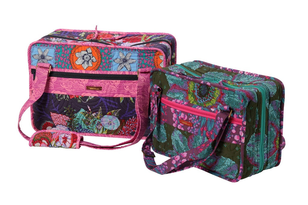 Bags open like suitcases to reveal handy see-through zippered compartments on each side. Attached pocket pages on the inside store and organize a multitude of smaller items.
