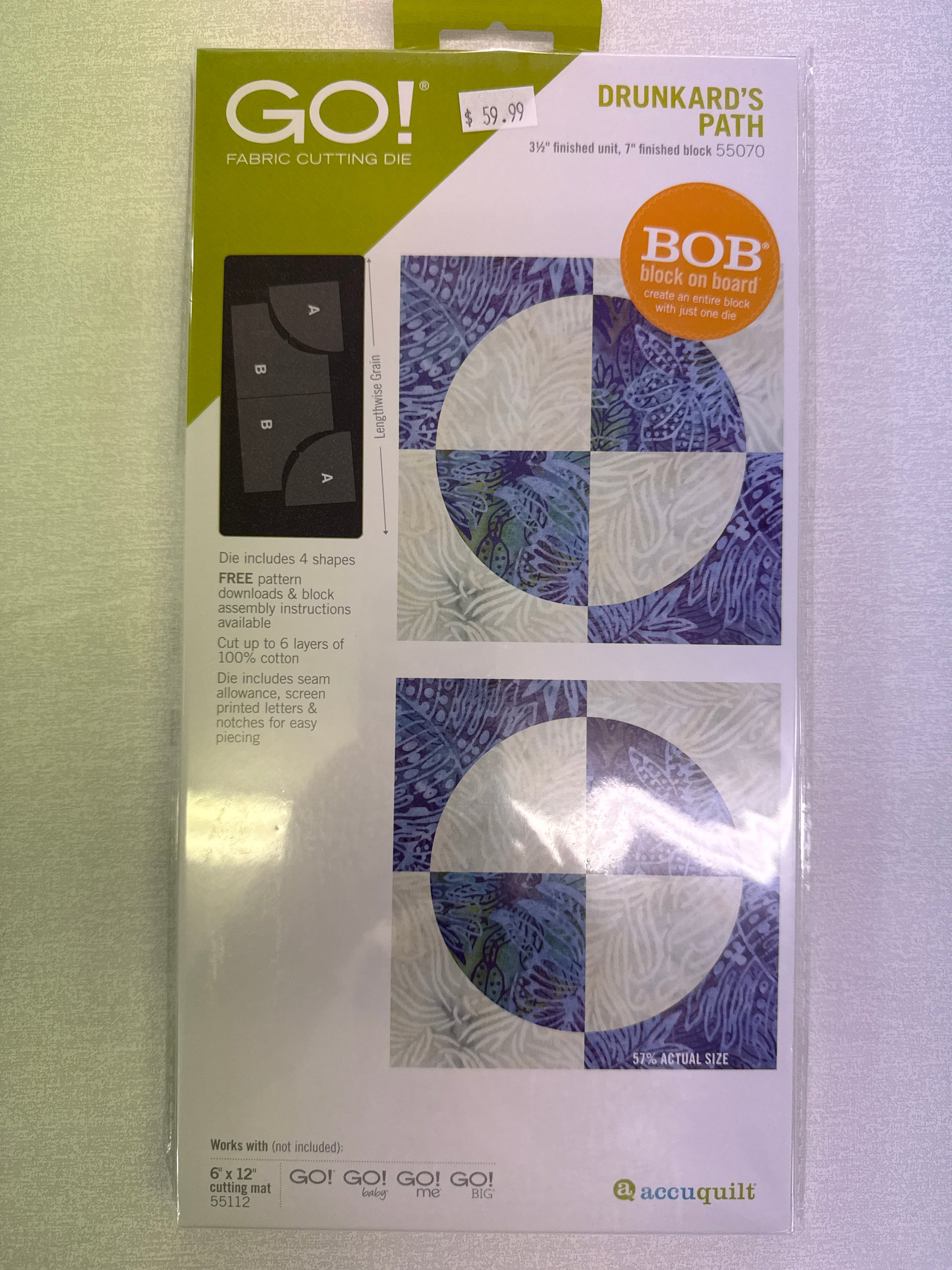 "Piece together perfect drunkard's path blocks with ease using the Accuquilt Go Drunkard's Path Die! Effortlessly create unique 3.5 inch finished blocks, making it the perfect addition to any quilting project. No more struggling - just happy crafting! (Hangovers not included.)"