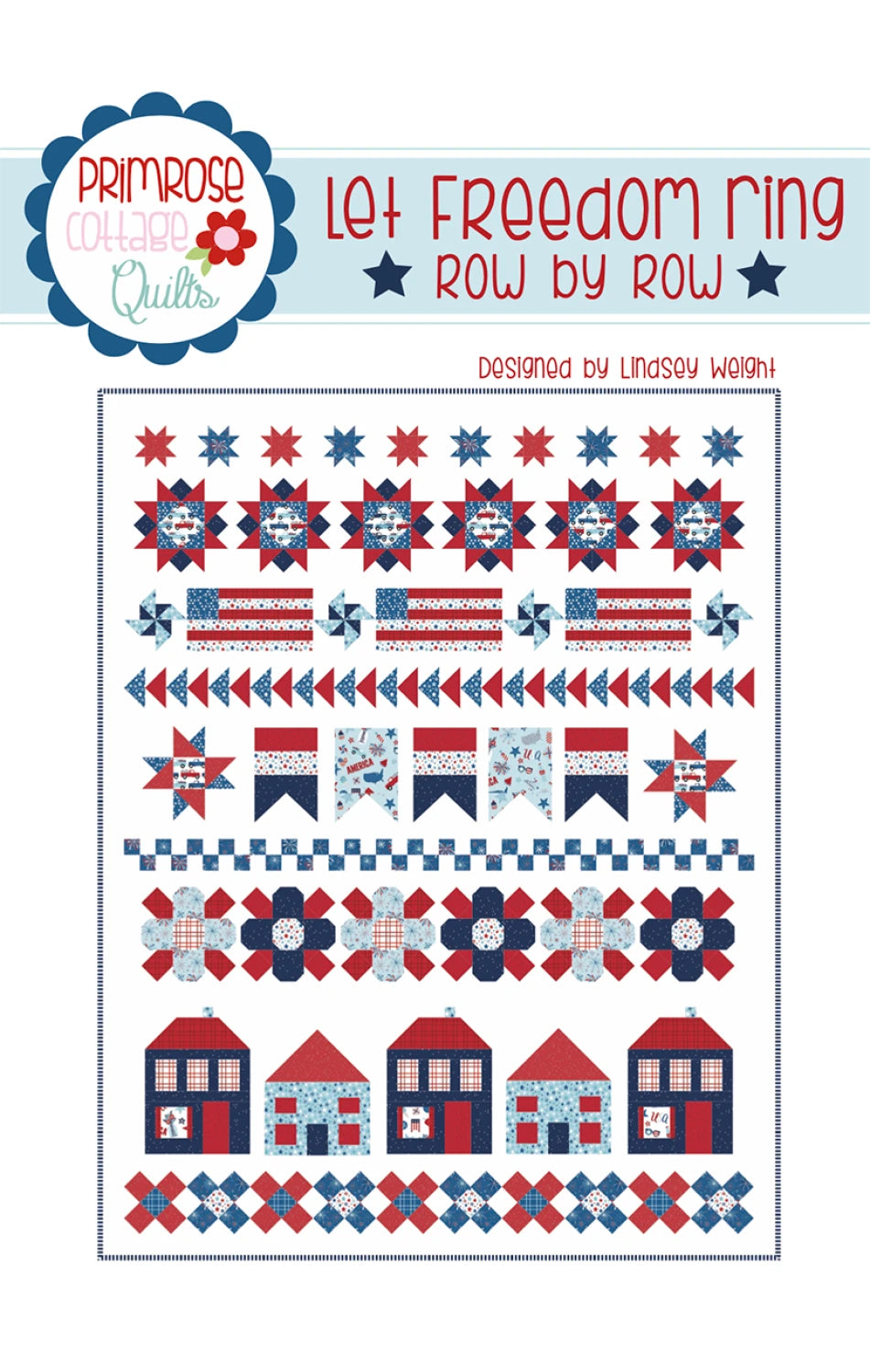 The Let Freedom Ring Row-by-Row Quilt by Primrose Cottage Quilts features rows of pieced stars, flags, pinwheels, banners, flying geese, houses, and more. Finished size is 64" x 76".