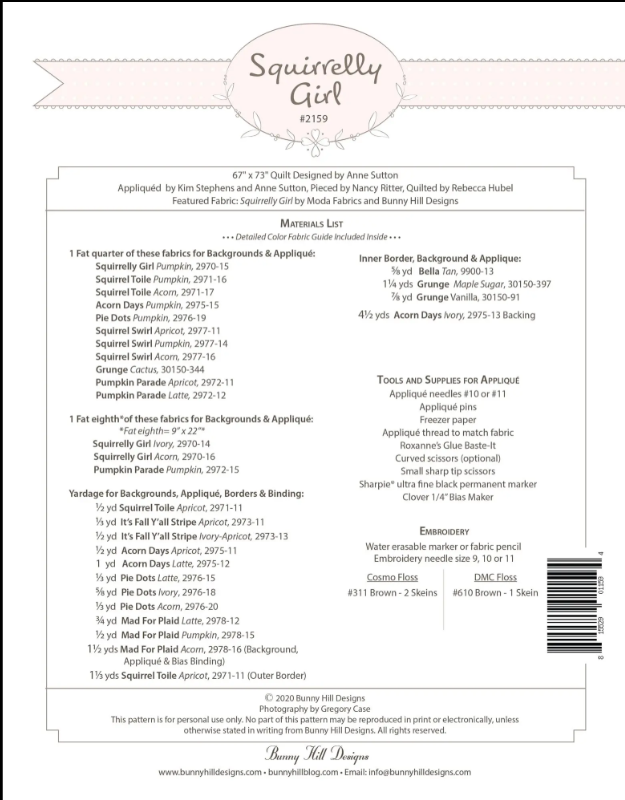 Squirrelly Girl is coming to town and bringing some applique fun your way! She’s a bit wild but cute as can be. She’ll make everyone who sees her smile. Make our quilt, and you’ll enjoy her year after year. With nine adorable appliqué blocks, we think you will love making this Autumn quilt. Squirrelly Girl finishes at 67” x 93”. Pattern only, fabric not included.