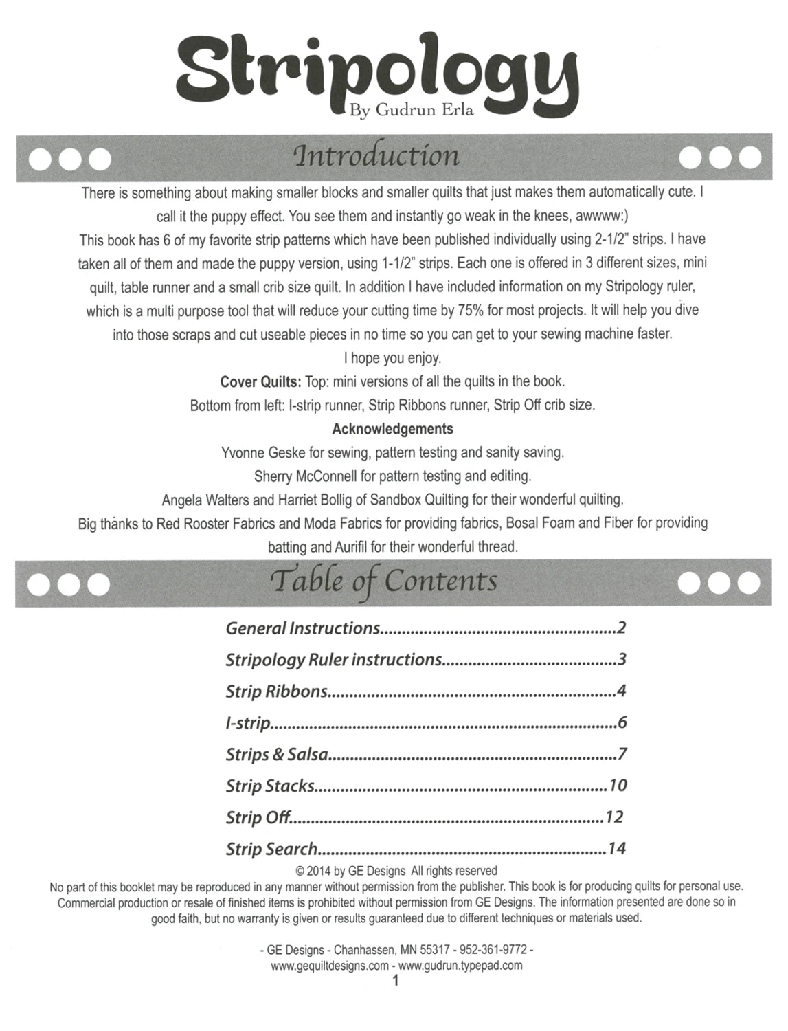 Booklet is 16 pages and includes 6 quilt designs, each offered in three different sizes: mini, table runner, and crib size. All the quilts are made using 1-1/2" strips and the book features the Stripology ruler by GE Designs which can reduce your cutting time by 75%. Simple piecing makes the projects suitable for beginner to intermediate skill level. Uses Creative Grids Stripology Ruler. CGRGE1XL