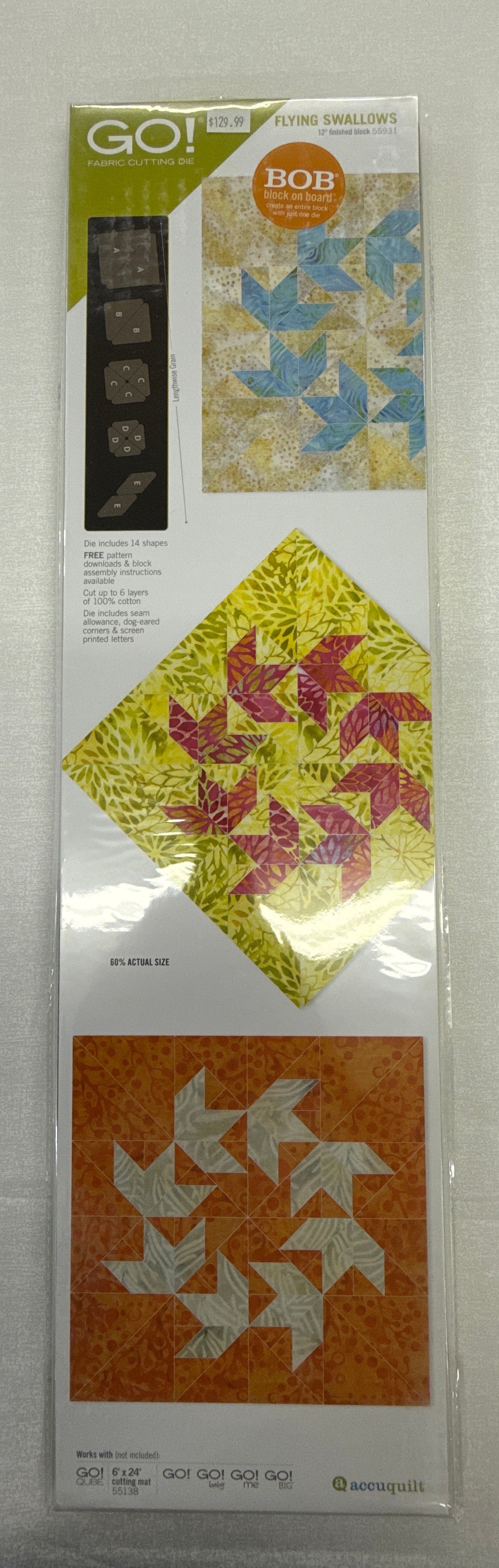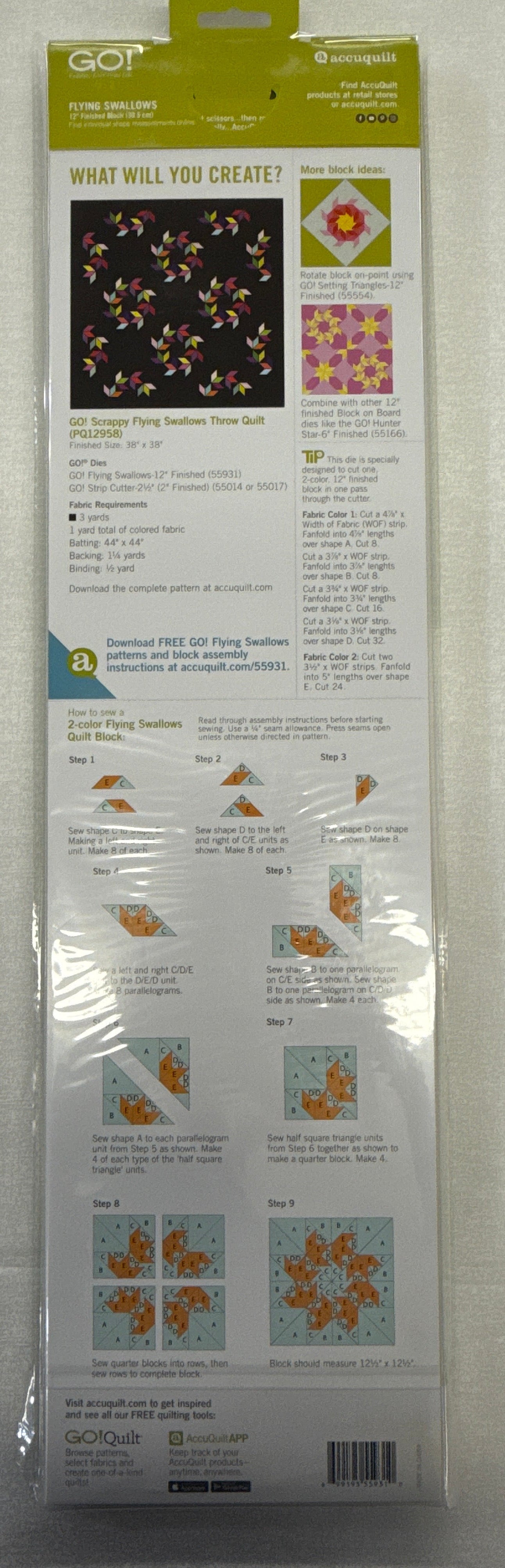 "Add some swoop and soar to your next quilting project with the Accuquilt flying swallows die. Effortlessly cut out perfect 12” finished flying swallow blocks for a whimsical touch to any design. Take your quilting to new heights with this fun and versatile die!"